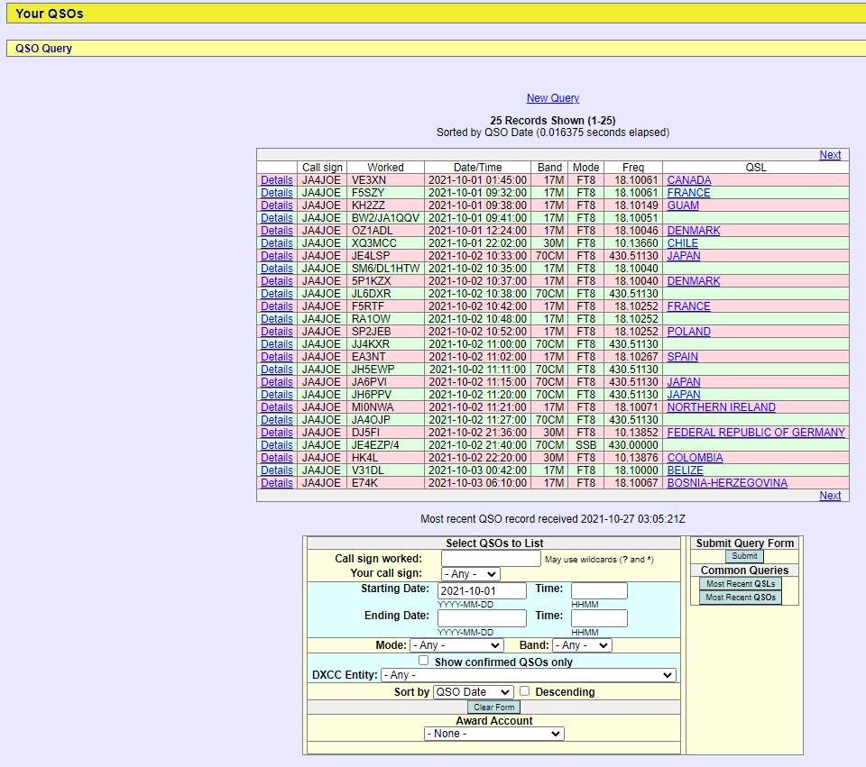 指定期間のログを参照できます。QSL欄に国名が入った局は相手からもログがアップロードされた交信成立局(Confirmed)です。
