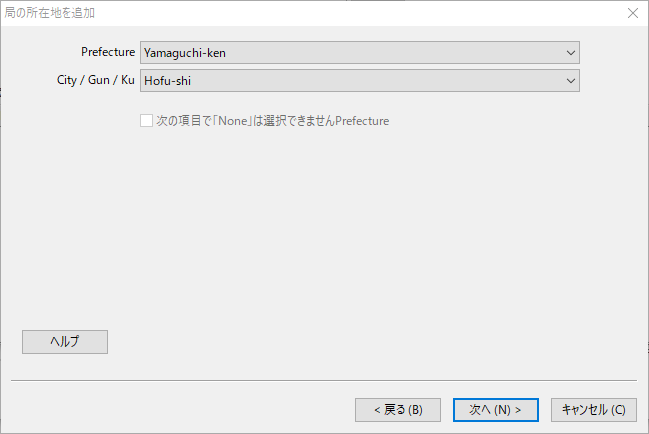 Prefecture、Cityを選択して「次へ」