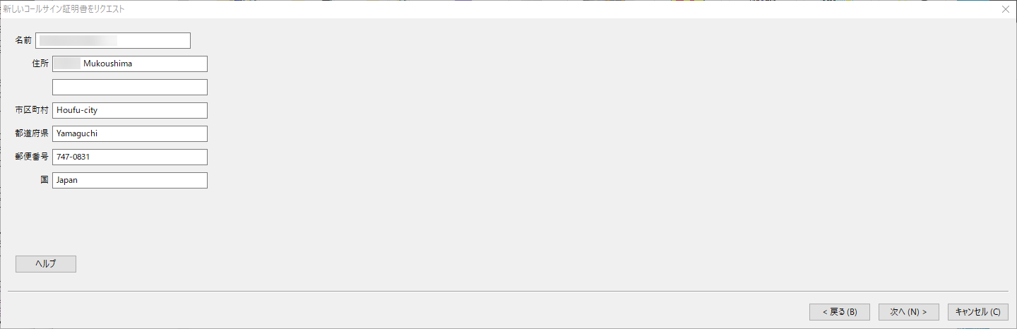 名前、住所、国名を入力して、次へ