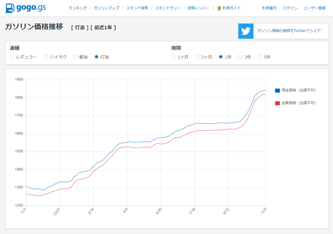 昨シーズンと比べてガソリン、灯油とも30%以上の値上がりですね。