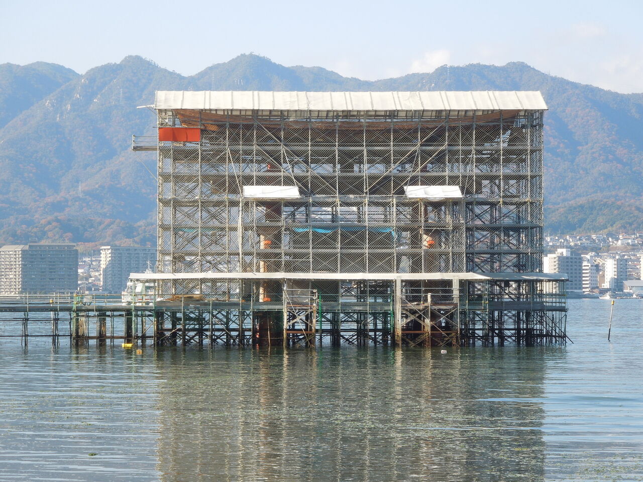 なんと、まだ大鳥居が工事中でした。厳島神社の入場券売り場で聞いてみたら「令和元年から工事を始めて、新たな修理箇所が増えるので終了時期は未定です。」だそうです。まだ2年くらいかかるようです。