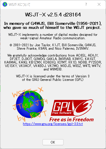 開発チームのG4WJS Bill SomervilleさんがSK(Silent Key)になられたので、WSJT-X 2.5.3 からヘルプの「WSJT-Xについて」に以下の記述が追加されました。まだ、65歳だったんですね。(-_-;)