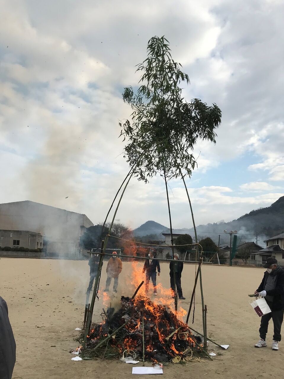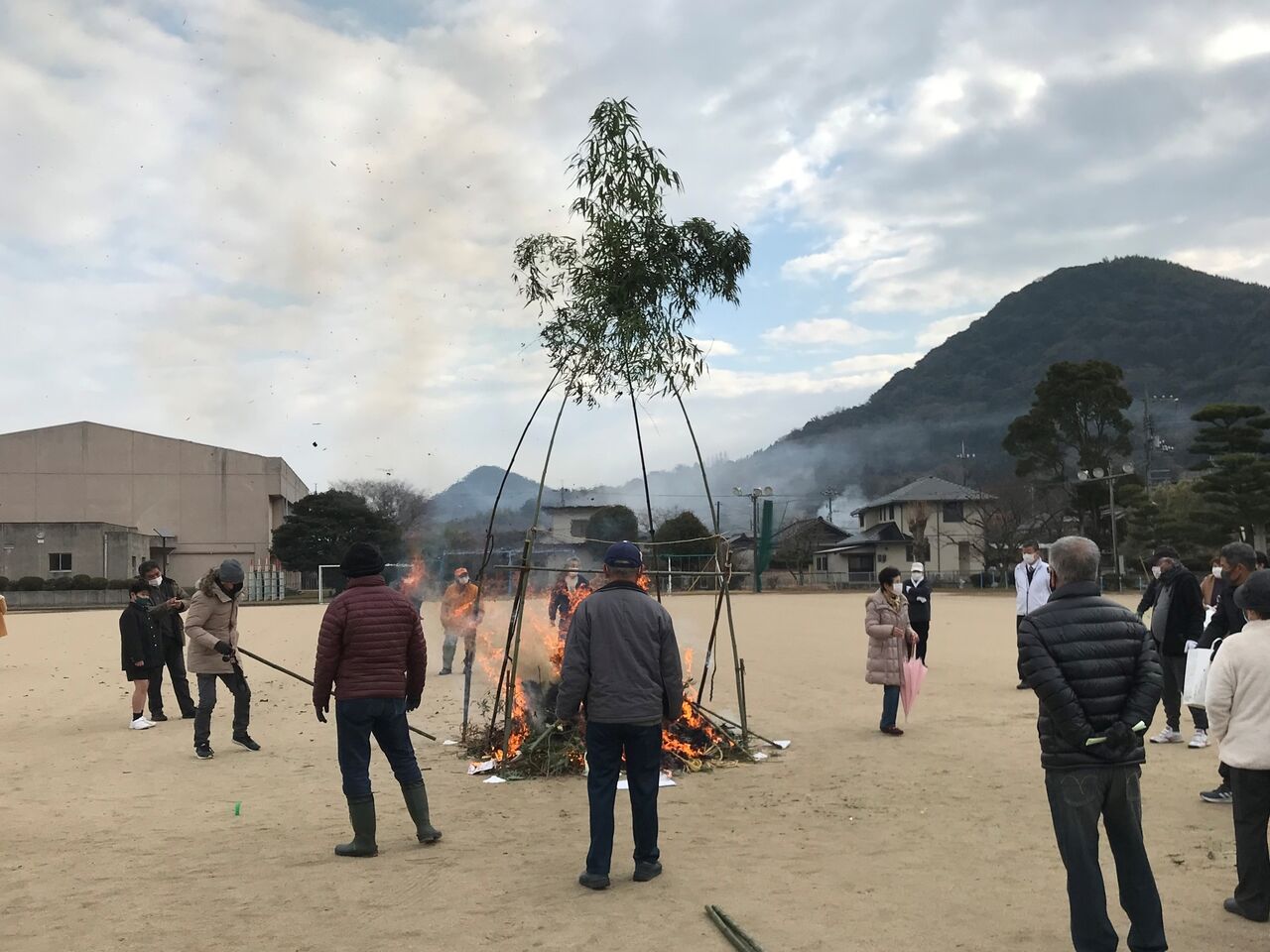 今日は向島小学校で向島地区のどんど焼きがありました。