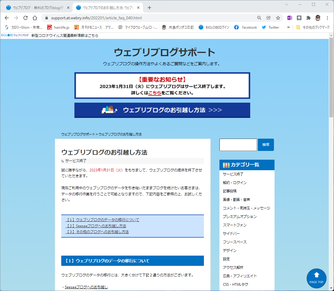 先日の記事「ウェブリブログサービス終了」でウェブリブログが来年1月にサービス終了になる話を書きましたが、ウェブリブログサポートに引越し方法が書かれていました。