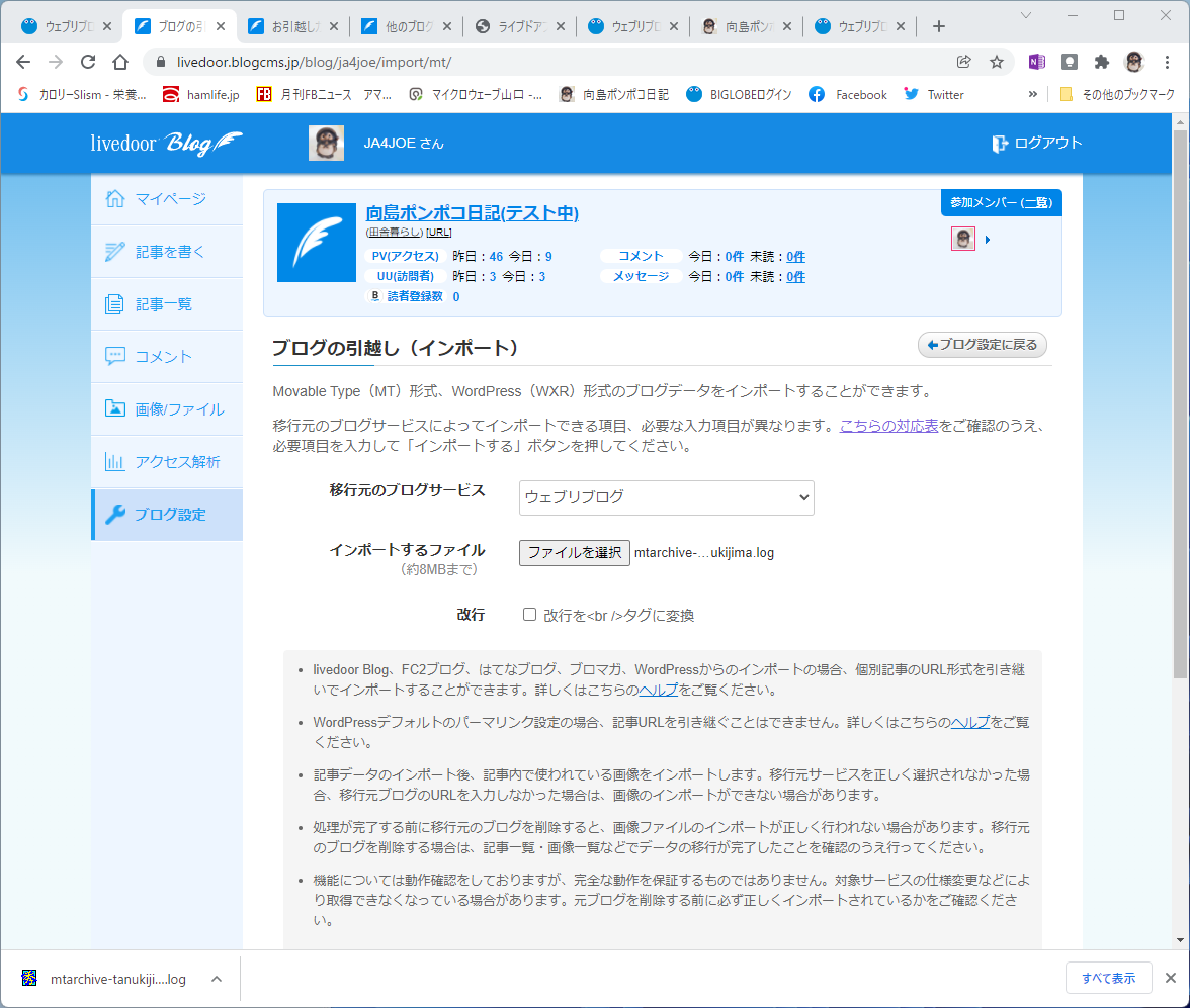 ウェブリブログのエクスポートで「MovableType3」ファイルを出力してライブドアブログで読み込む事が出来るそうです。