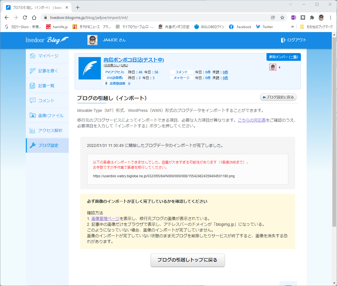 移転したデータが1月29日までのものだったので、1月30日以降は改めてインポートしないといけませんが、ブログ内リンク問題が解決すれば 充分使えそうです。