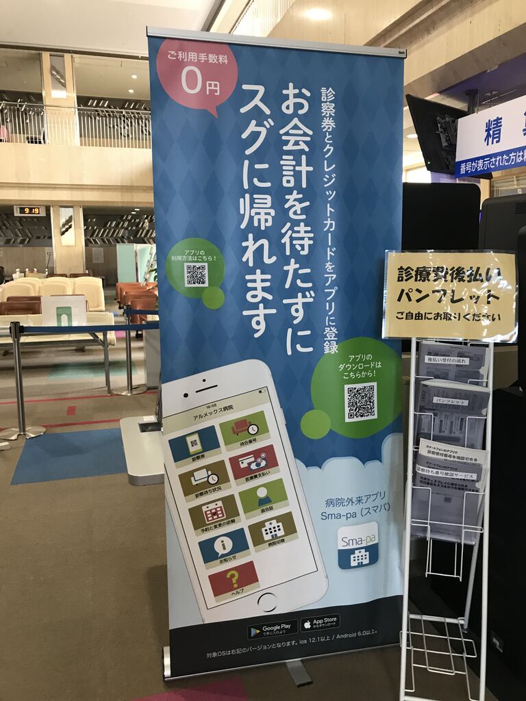 そして、またまた気になったのですが、再来受付機の横に「Sma-pa」なるアプリのノボリがありました。以前からあったのですが、会計の手間は大したこと無いので関係無いかなと思って無視していました。