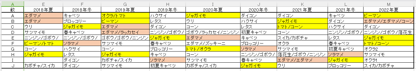 ここ4年の履歴です。畝が10畝あるので、豆類とナス類が連作にならないように計画しています。