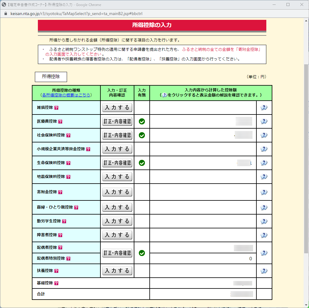 所得控除の画面で医療費控除、社会保険料控除(国民健康保険)、生命保険料控除、配偶者控除などを入力します。