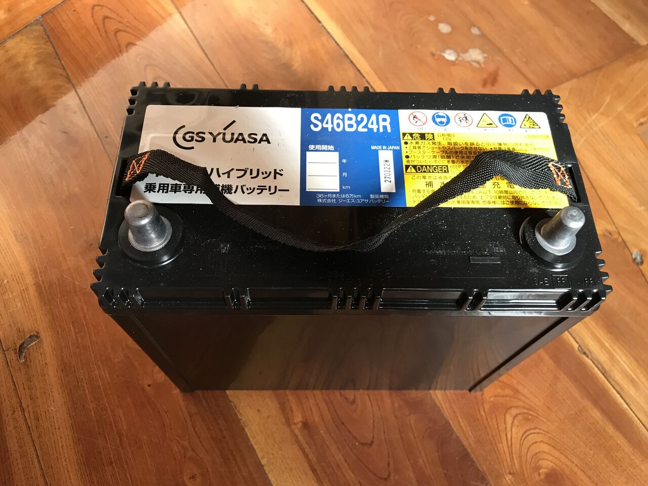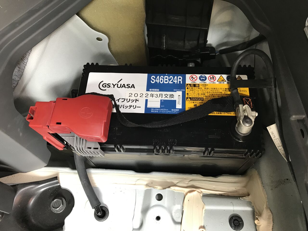 ⑩ 逆の手順で、バッテリー端子(今度はプラスが先)、ガス抜きホース、バッテリー止め金具を取り付けます。交換年月を書いたシールを貼っておきました。