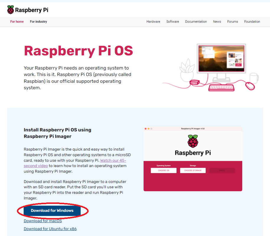 USBポートを変えたりしてみましたが、駄目なのでラズベリーパイ公式のダウンロードページより Raspberry Pi Imager をダウンロードしてmicroSDカードを作りました。