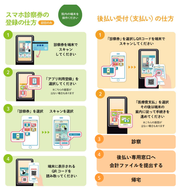 従来は診察後に会計窓口に受診ファイルを提出して自動精算機での支払いが出来るまでに5~10分くらいかかっていましたが、診療費後払いサービスを利用すると会計窓口に受診ファイルを提出するだけで帰れます。