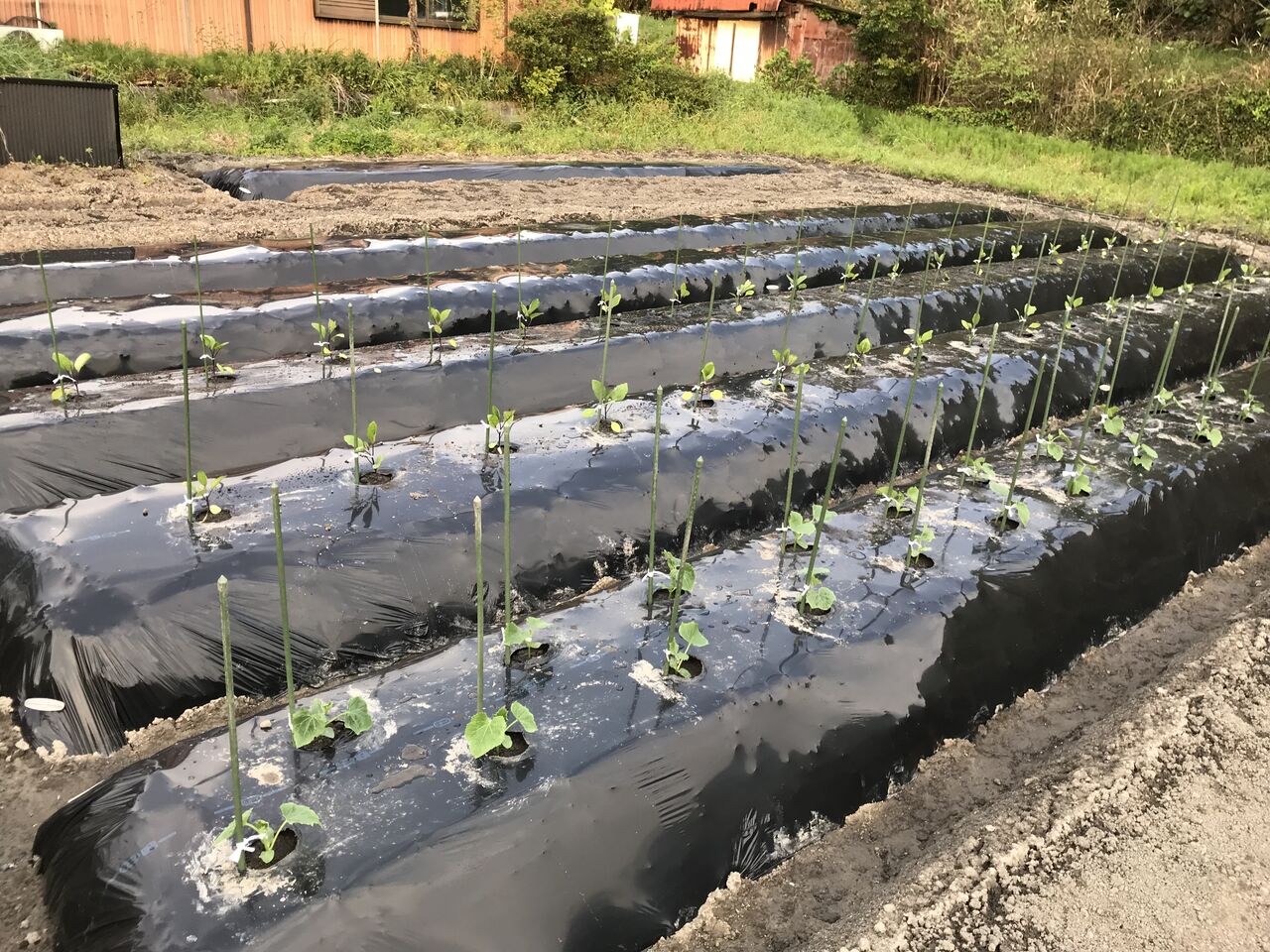 今日が雨なので、キュウリ、ナスを全部植付けたかったのですが、時間切れでナスは2畝しか植えられませんでした。