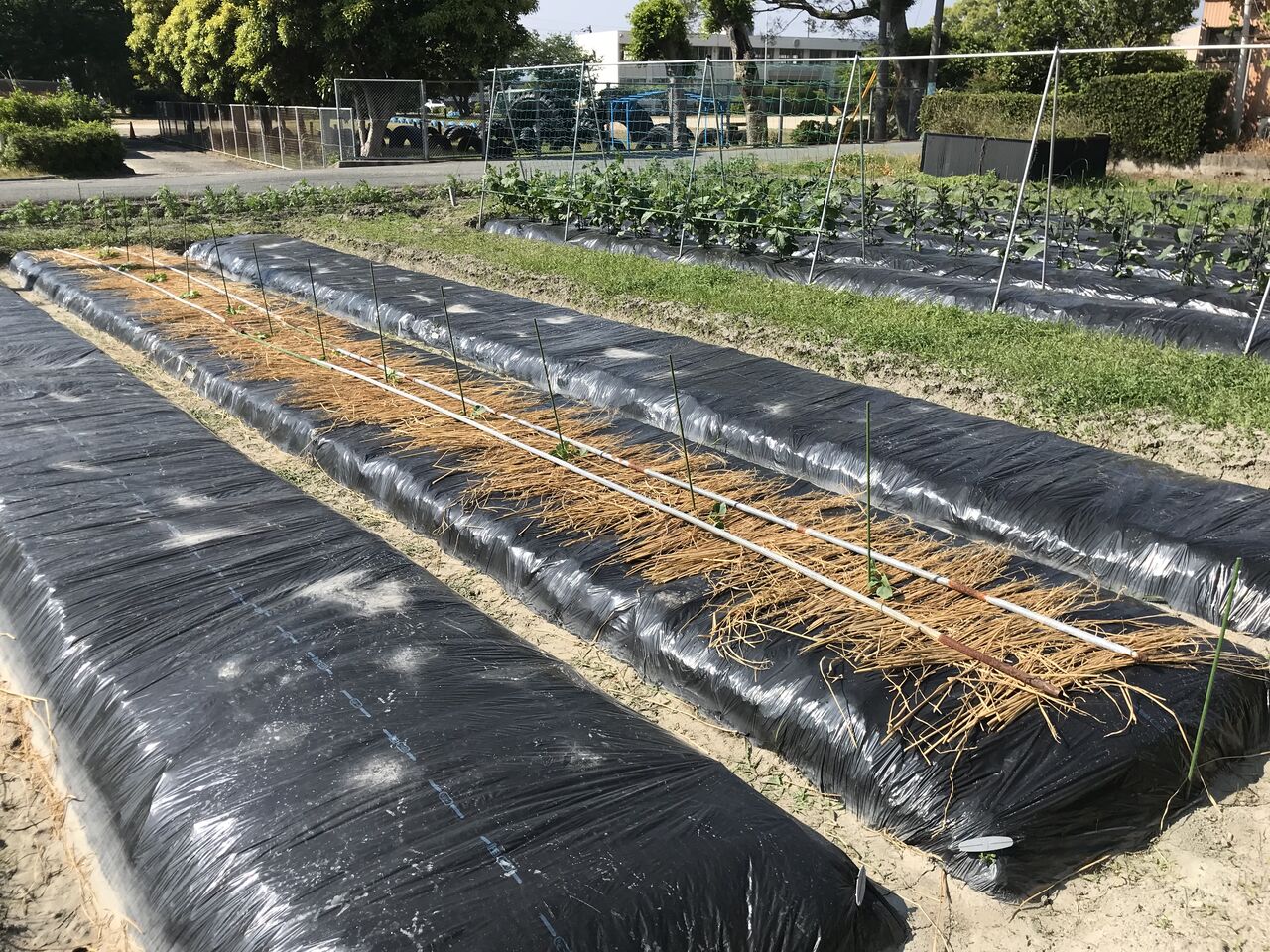 手前8本が金ウリです。ツルがマルチに直接触れないように藁を敷いておきました。