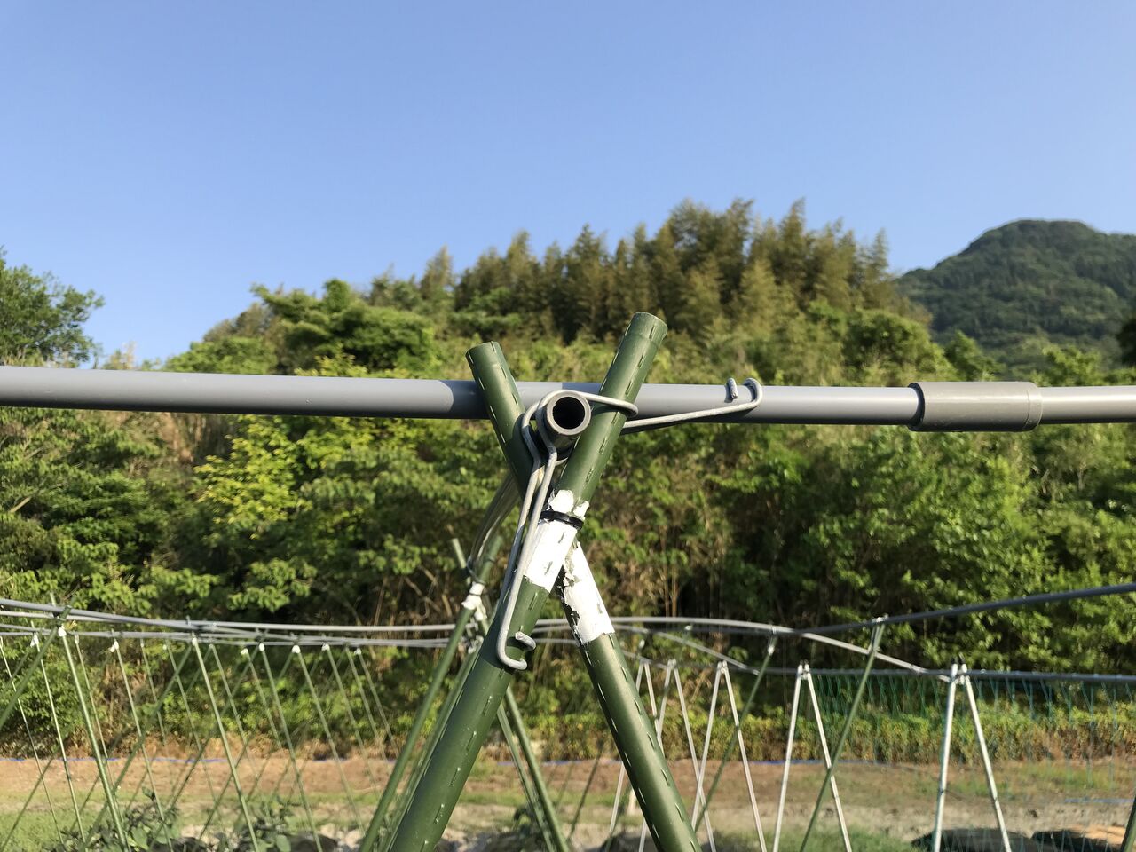 仕様は昨年と同じで16mmx2.4m支柱をV字に立てて、上に13mmの塩ビパイプ VP13 を乗せて強化しています。
