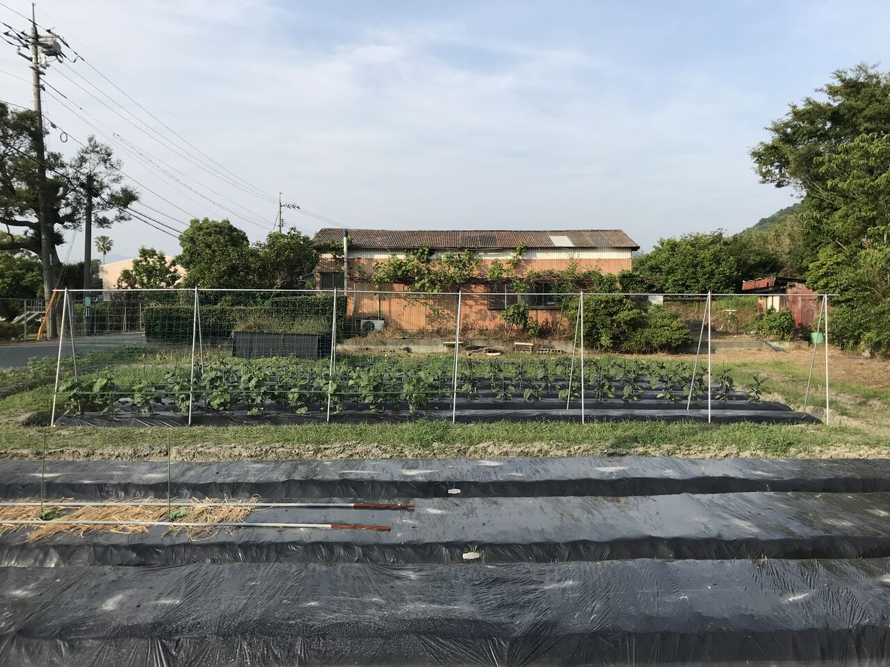 ナス、キュウリの支柱を設置したので様子が変わりましたね。サトイモも大きくなってきました。
