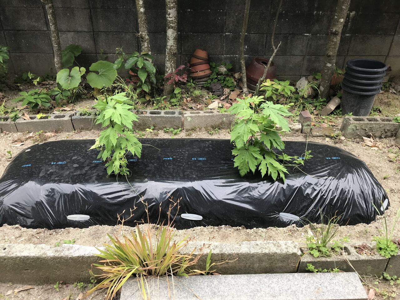 山側半分は2回目のキュウリを植えるため空けてあります。