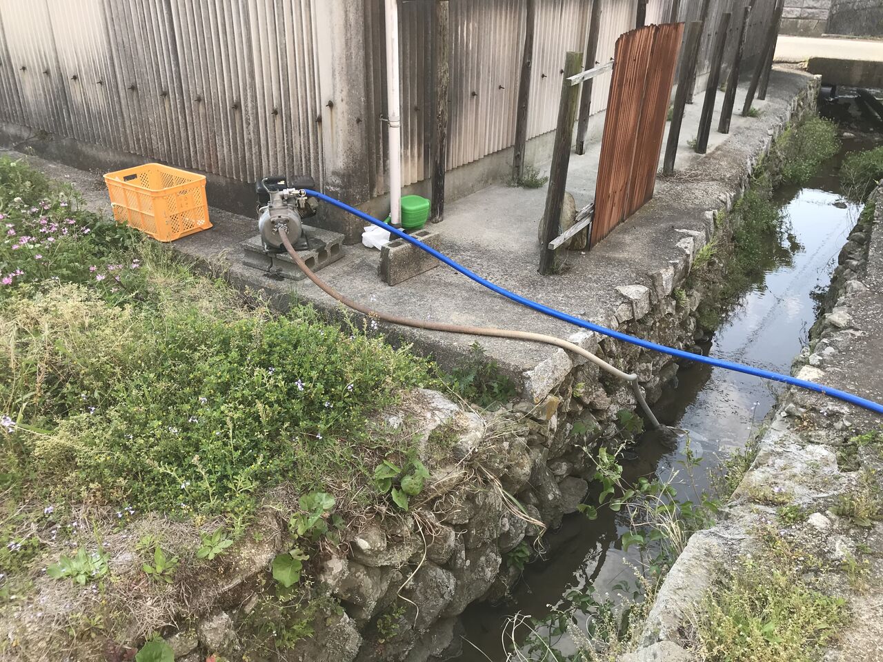 約100m離れた小川からホースを引いて、エンジンポンプで水を溜めて水やりに使います。