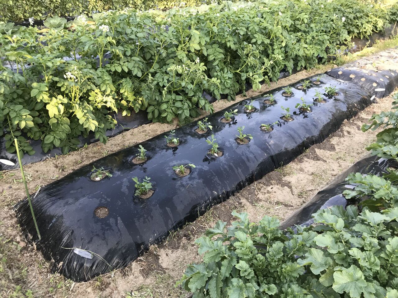 東側畑にはラッカセイを植えました。マルチをかけた畝が空いていたので、マルチ畝に植えました。