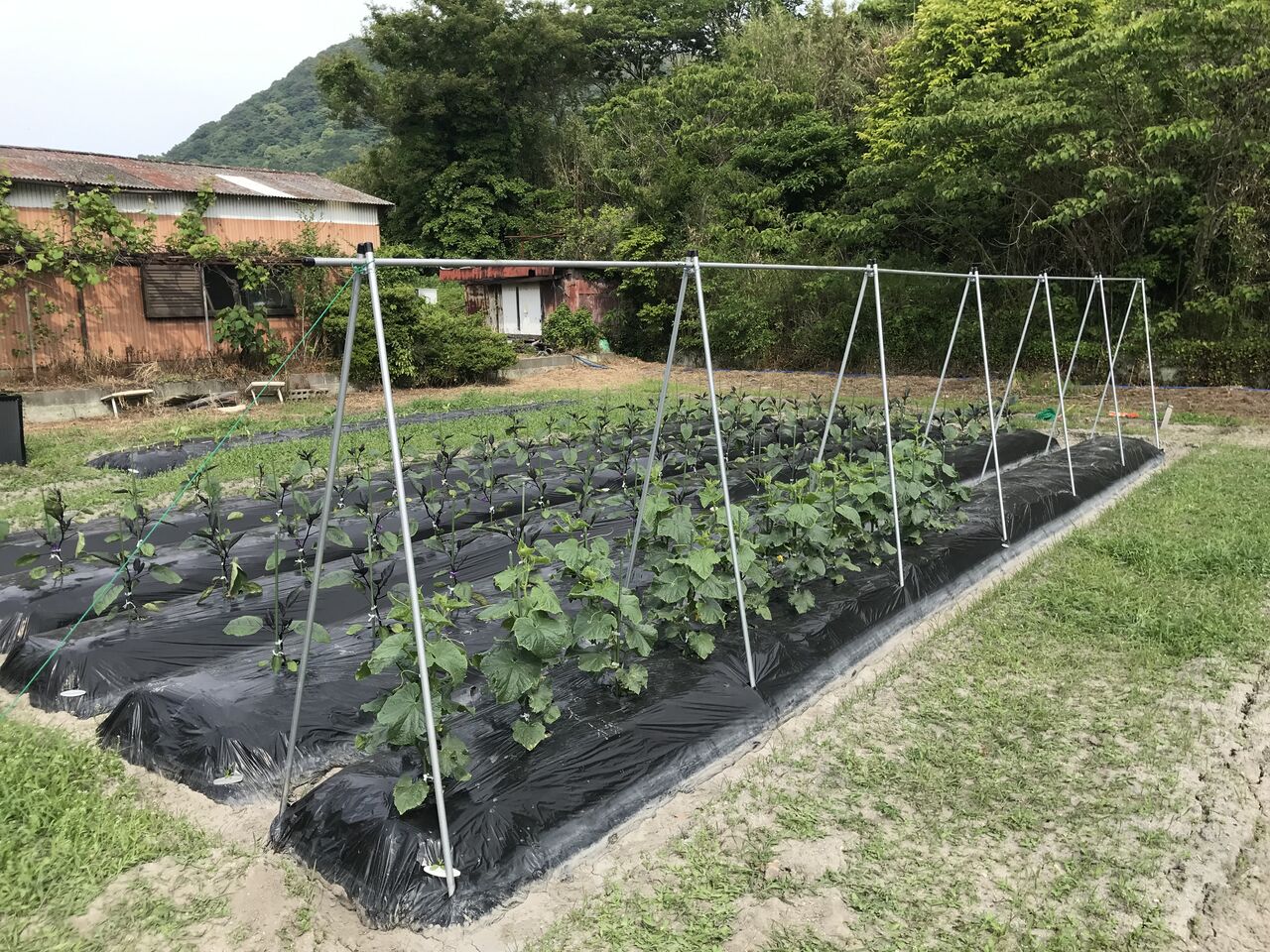 昨日はナスのV字支柱を設置しました。昨年は6月2日に設置しましたが、今年は早めに設置しました。