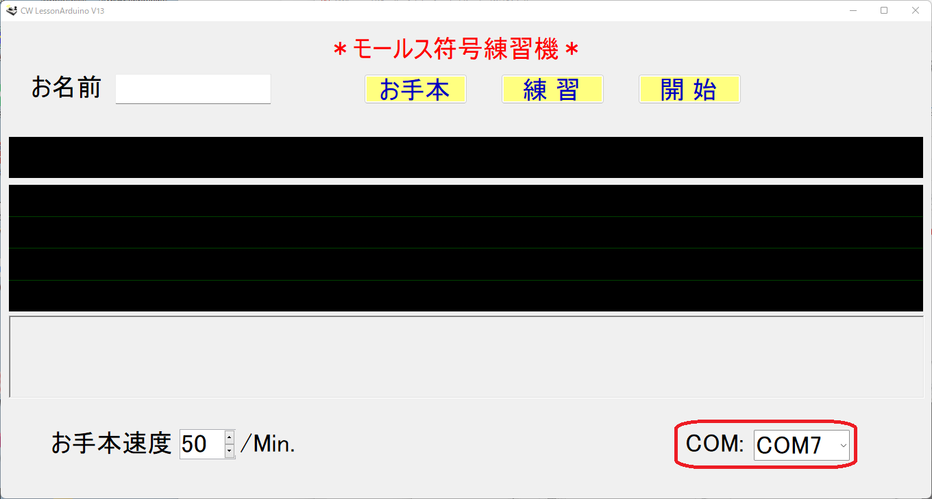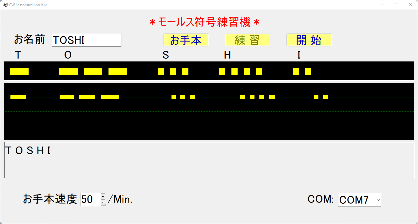 最初に「お名前」を入力します。[お手本]を選ぶとお手本の、モールス信号音が流れて、モールス符号が表示されます。