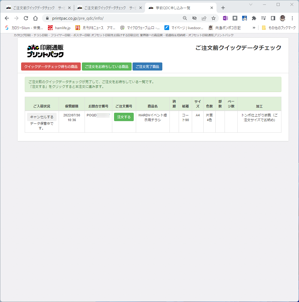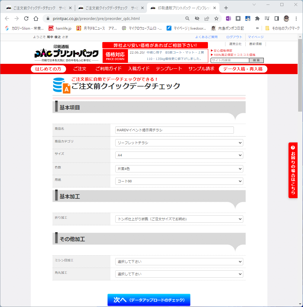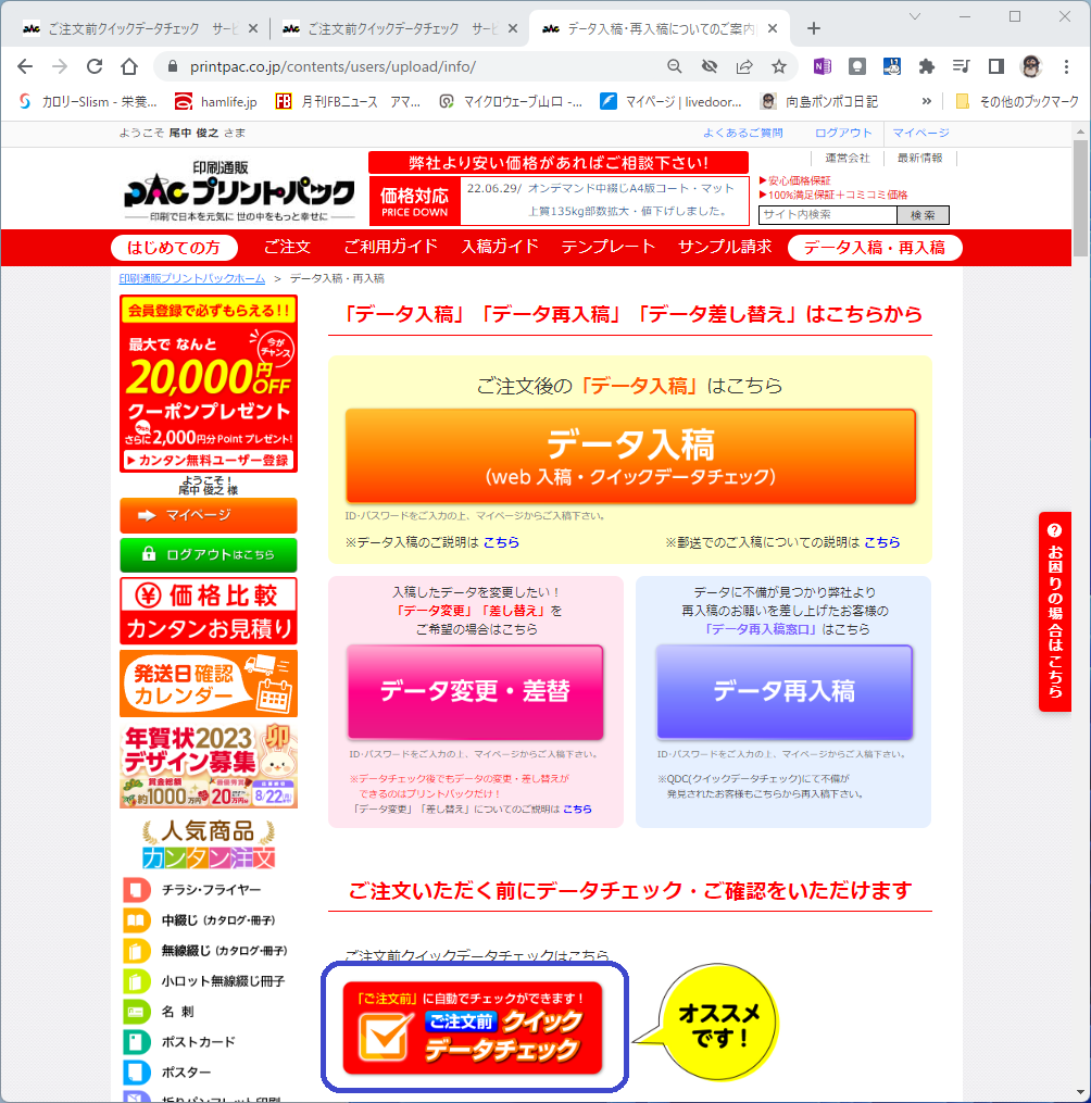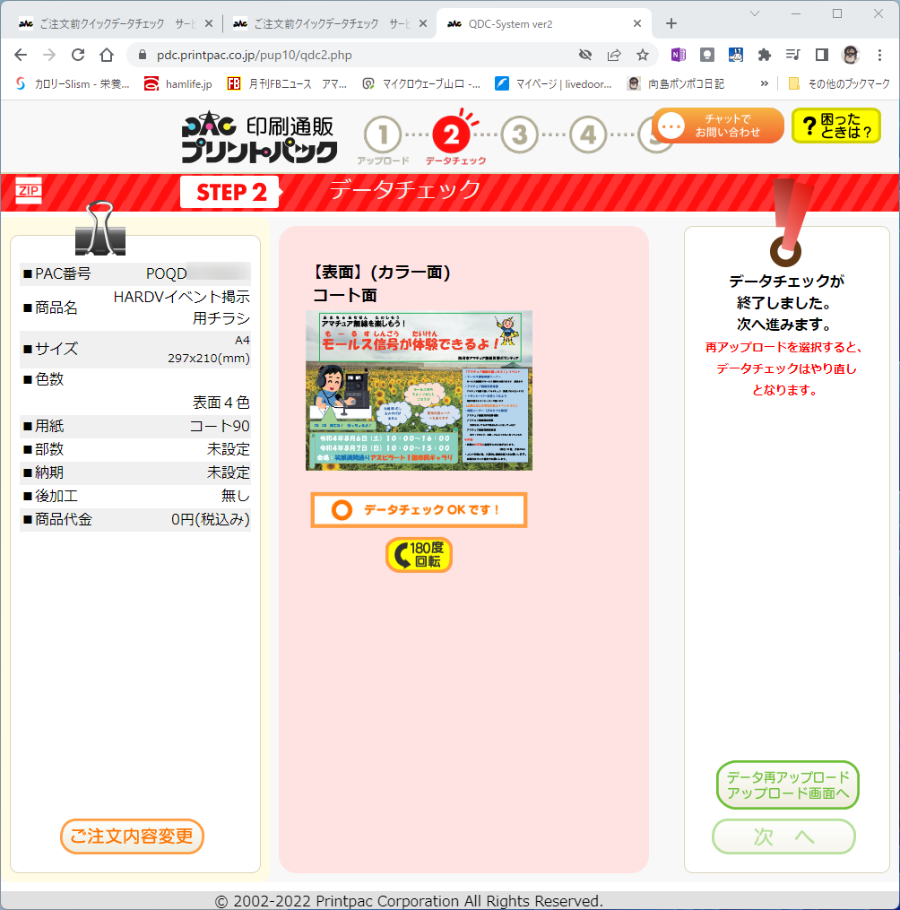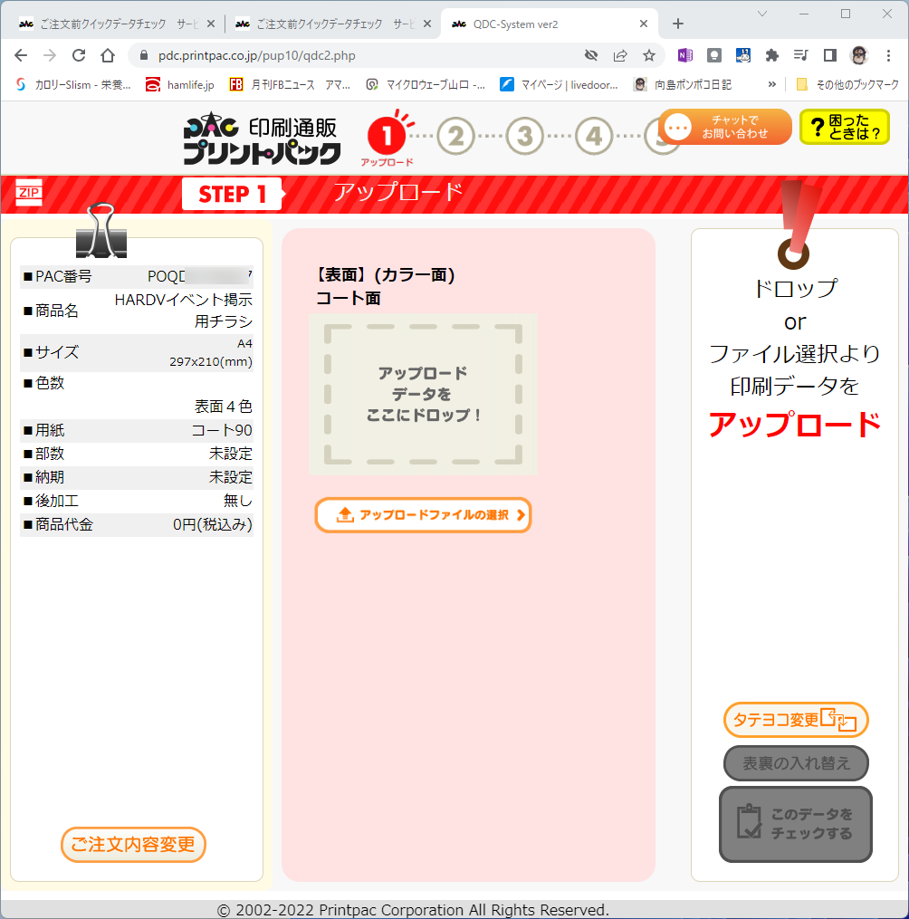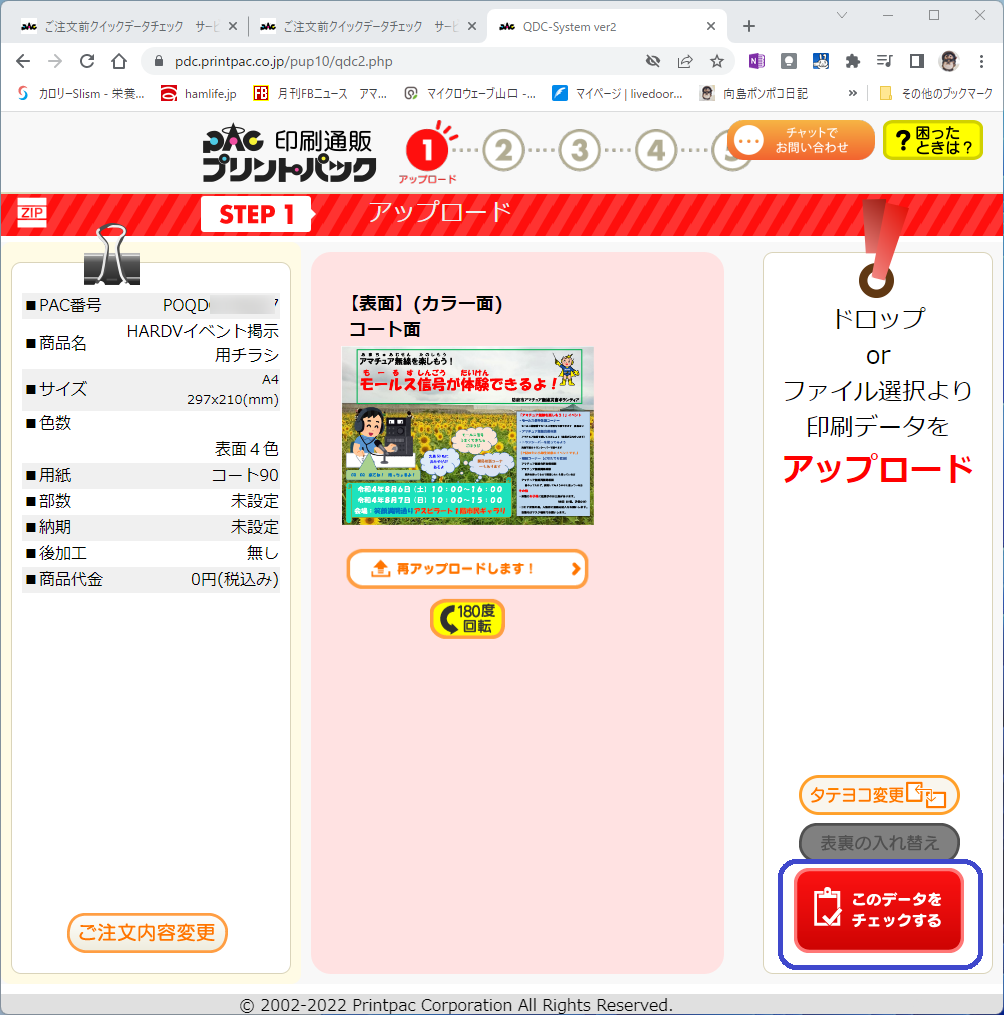 前回はPDFファイルを入稿してプリントパック側で余白を調整してもらいましたが、今回は「ご注文前 クイックデータチェック」というサービスを使って入稿しました。