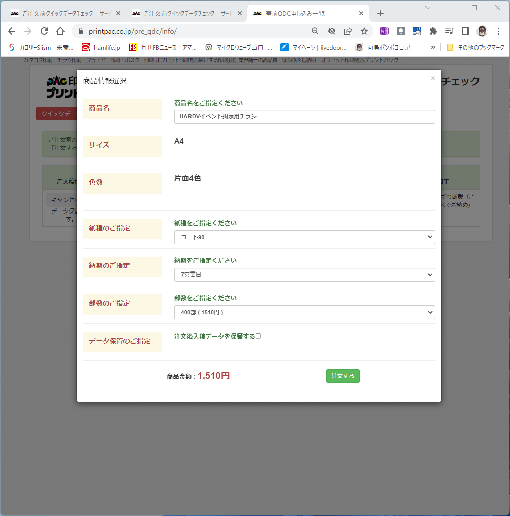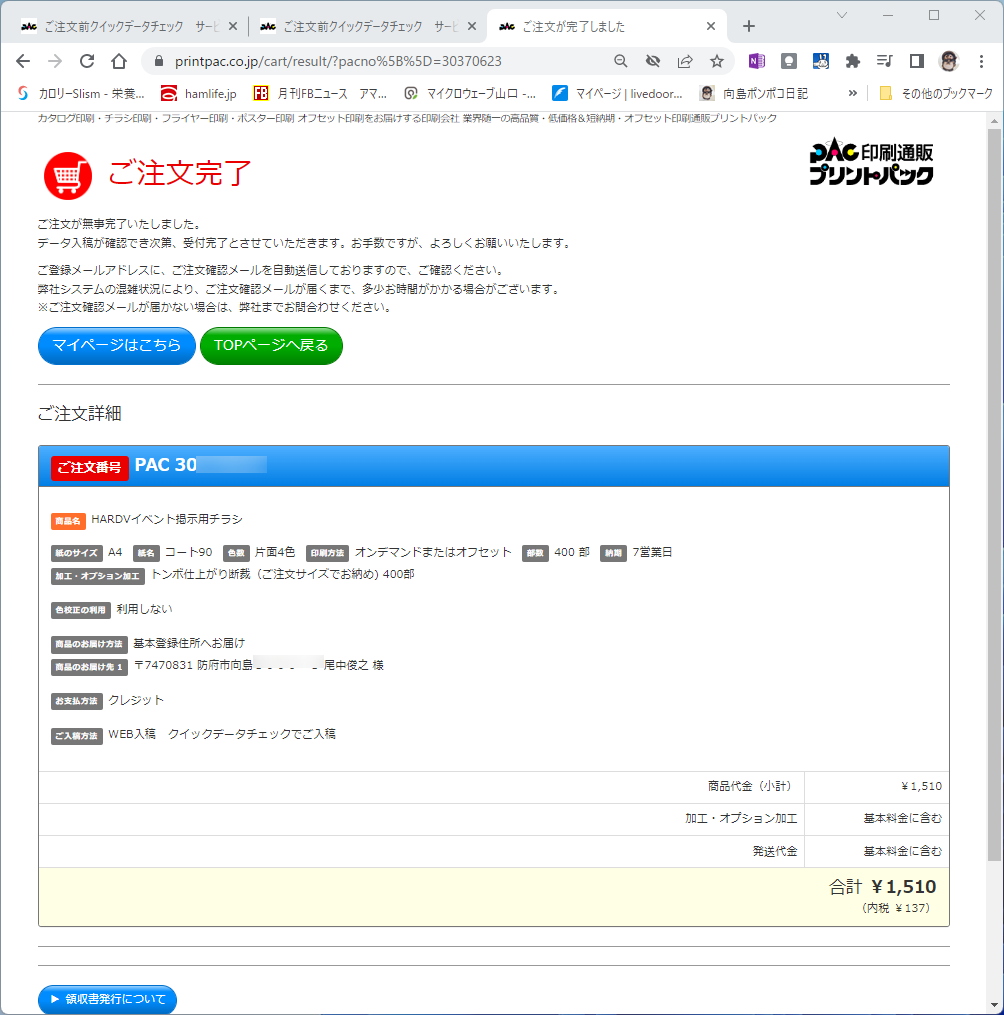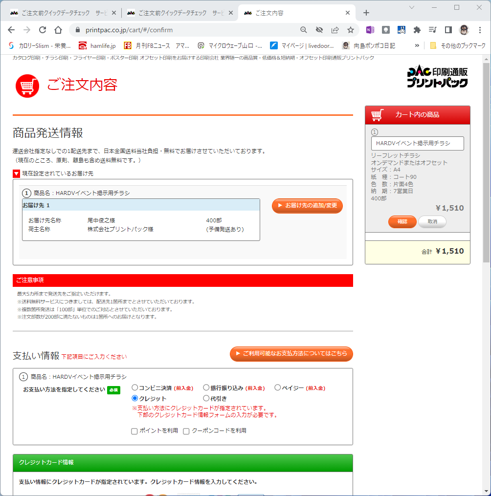 400枚印刷して1,510円でした。次画面でクレジットカードの情報を入れて注文します。
