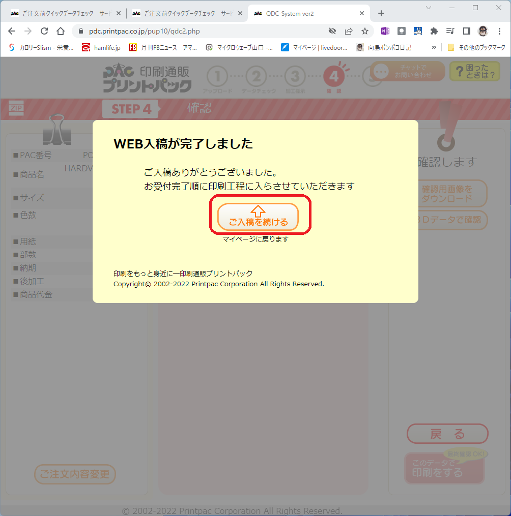 WEB入稿が完了したので「ご入稿を続ける」でマイページに戻ります。
