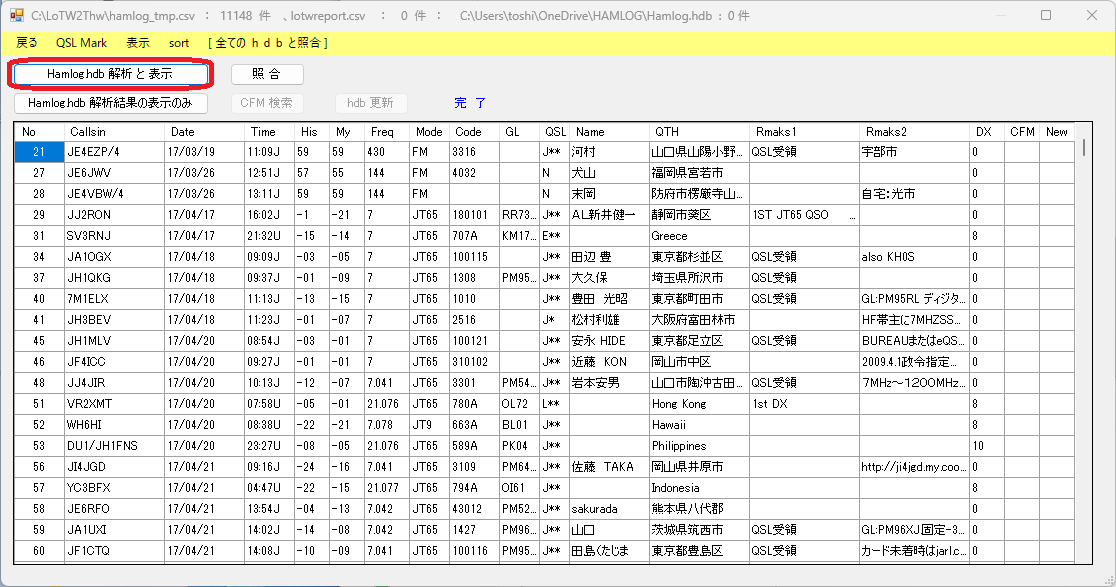 私は毎月一度、eQSL.ccとLoTWのコンファーム情報をHAMLOGのQSL欄3文字目(QSL受領マーク)に記入する作業をやっていますが、この作業にLoTW2Thwを使っています。(参考:オンライン ログとQSLカードの運用について)