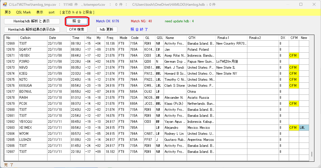 ⑤ 次に [照合] を行います。lotwreport.csvとHamlog.hdbの照会が行われて結果が表示されます。
