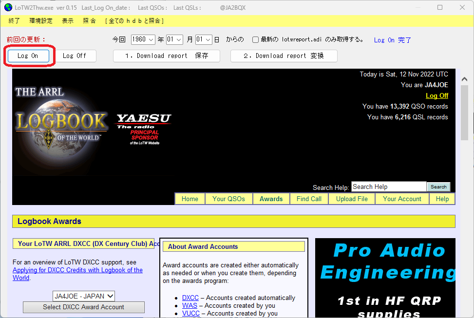 ① メイン画面の [log On] でLoTWにログインした状態になります。