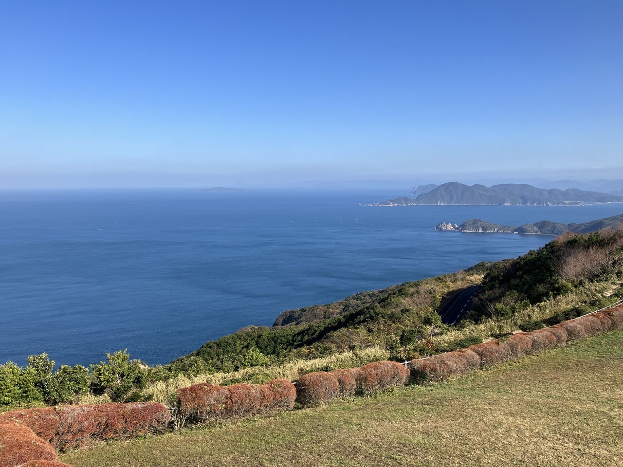 見通しの良い日なら朝鮮半島が見えるのでしょうが、相島と見島がなんとか見えました。右側に見えるのは青海島です。
