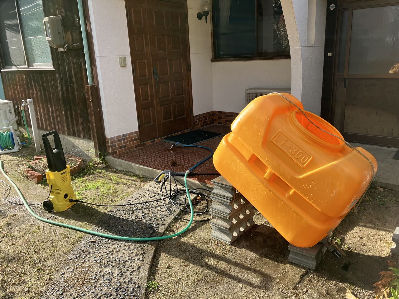 300Lローリータンクは内側に水苔が付いているので、12月1日に自宅に持ち帰って高圧洗浄機で洗いました。タンクから水が抜けやすいように斜めにして洗いました。