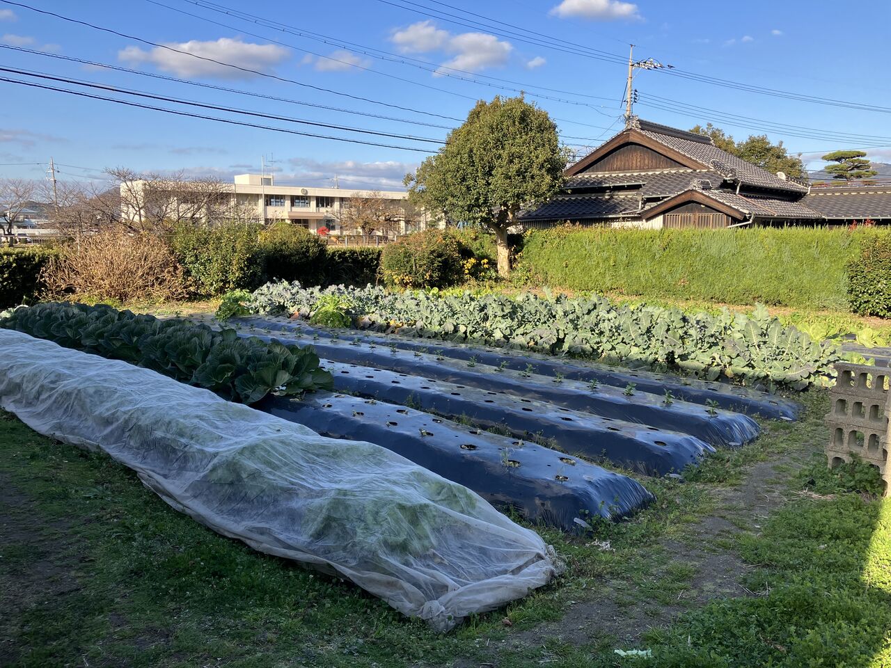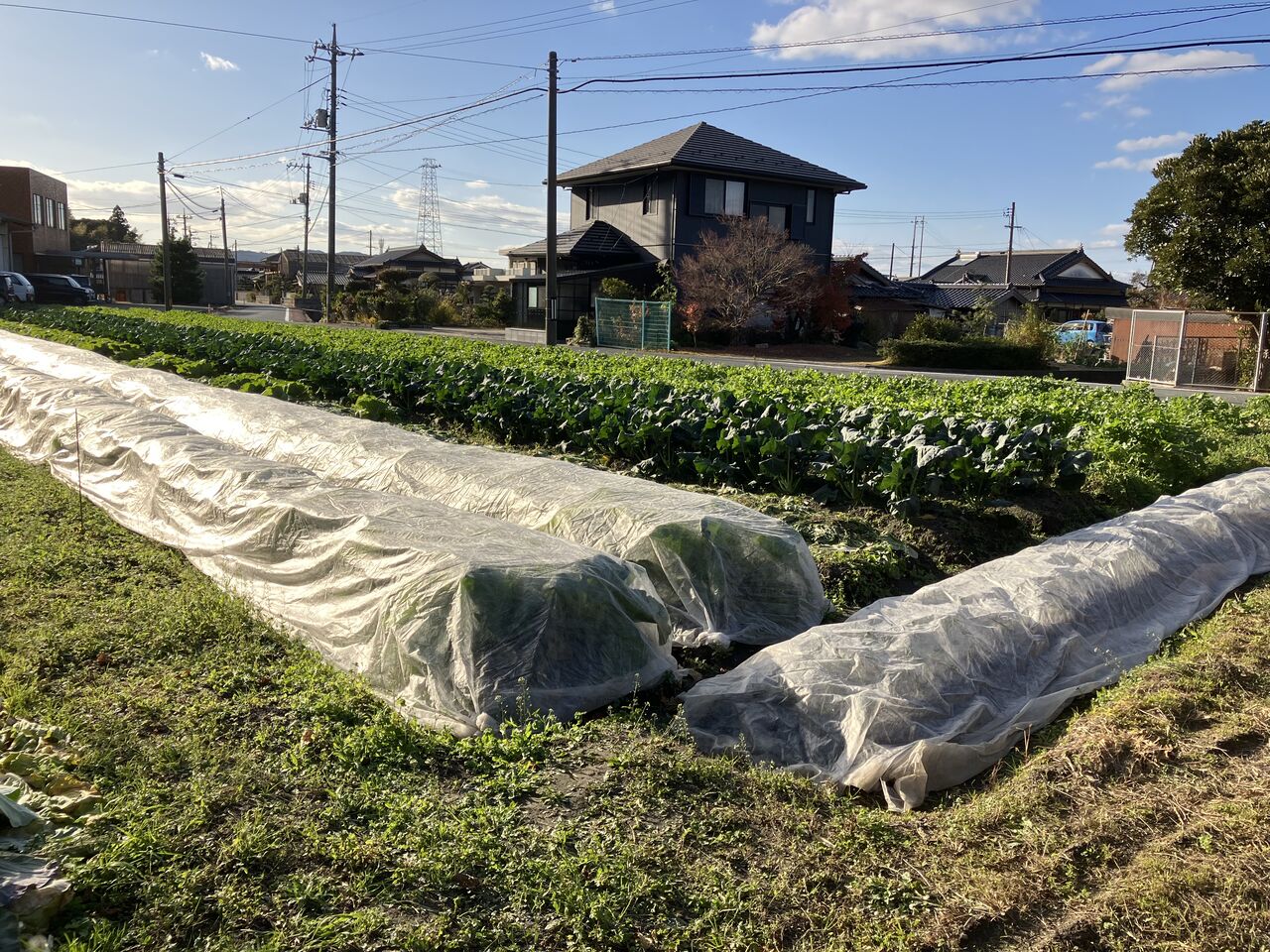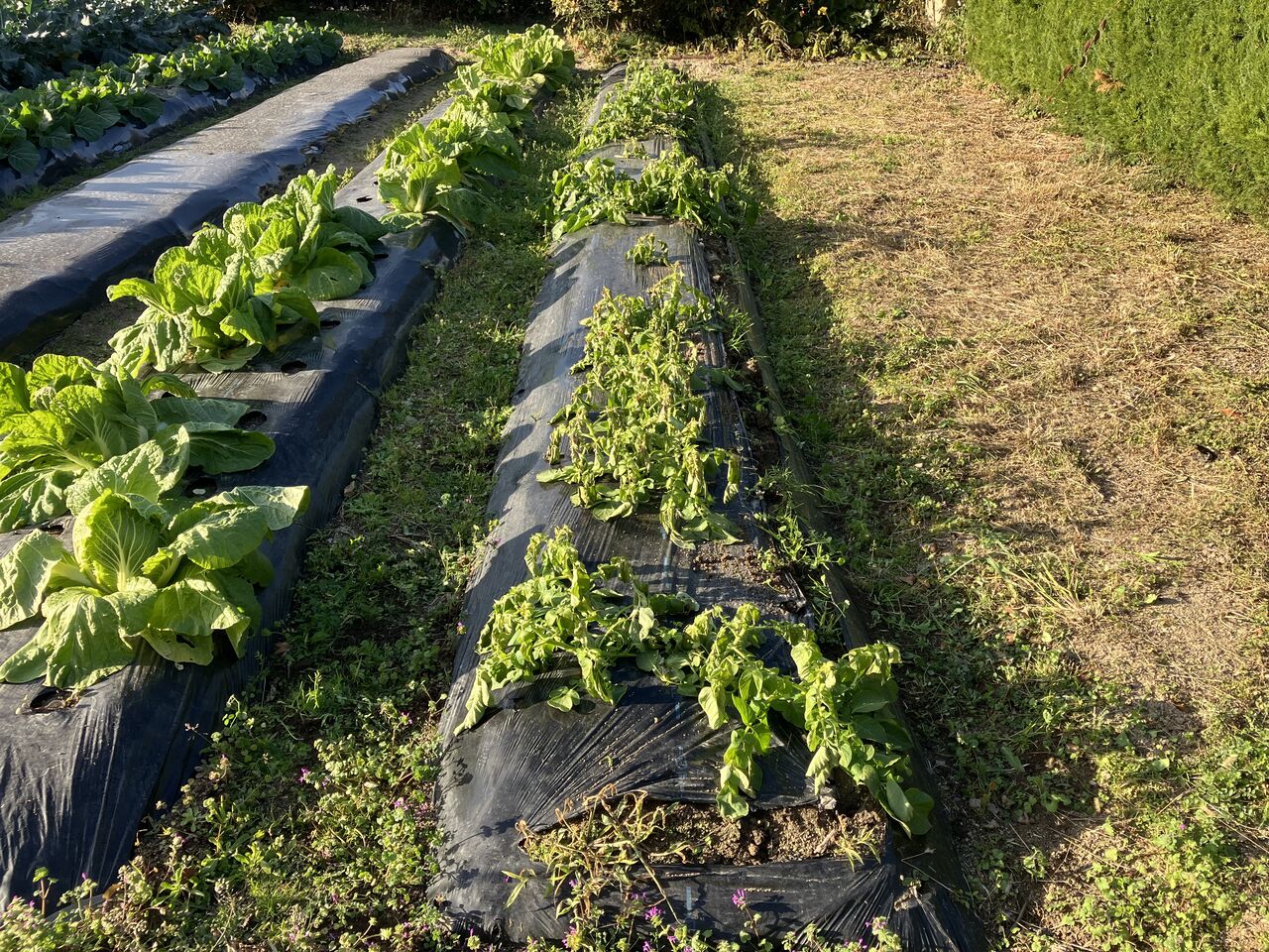東側畑の様子です。レタスに不織布(パオパオ)をかけました。キャベツがだいぶ減りました。