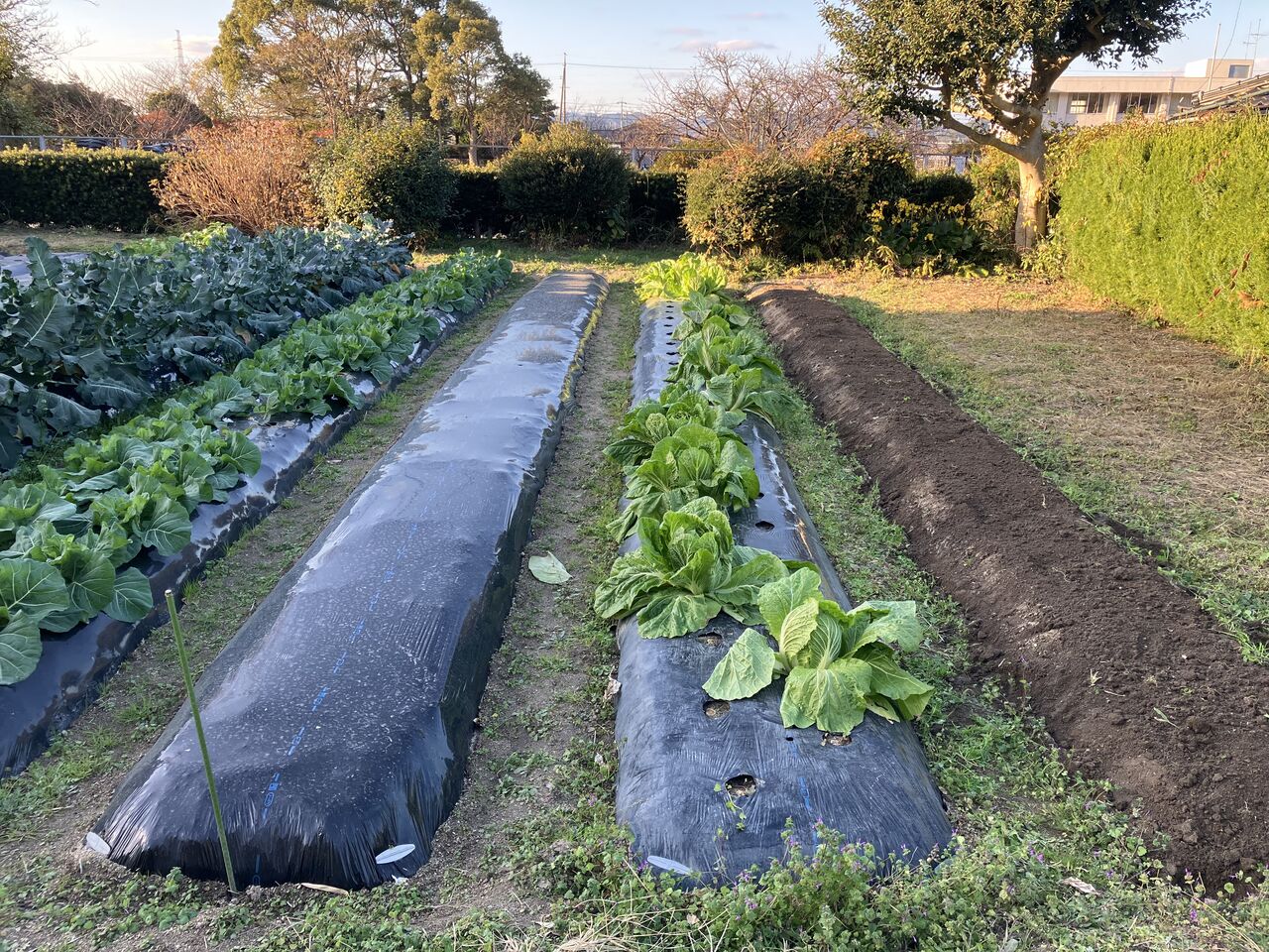 奥の畝です。マルチをかけたままの畝は初夏採りキャベツを植える予定の畝です。