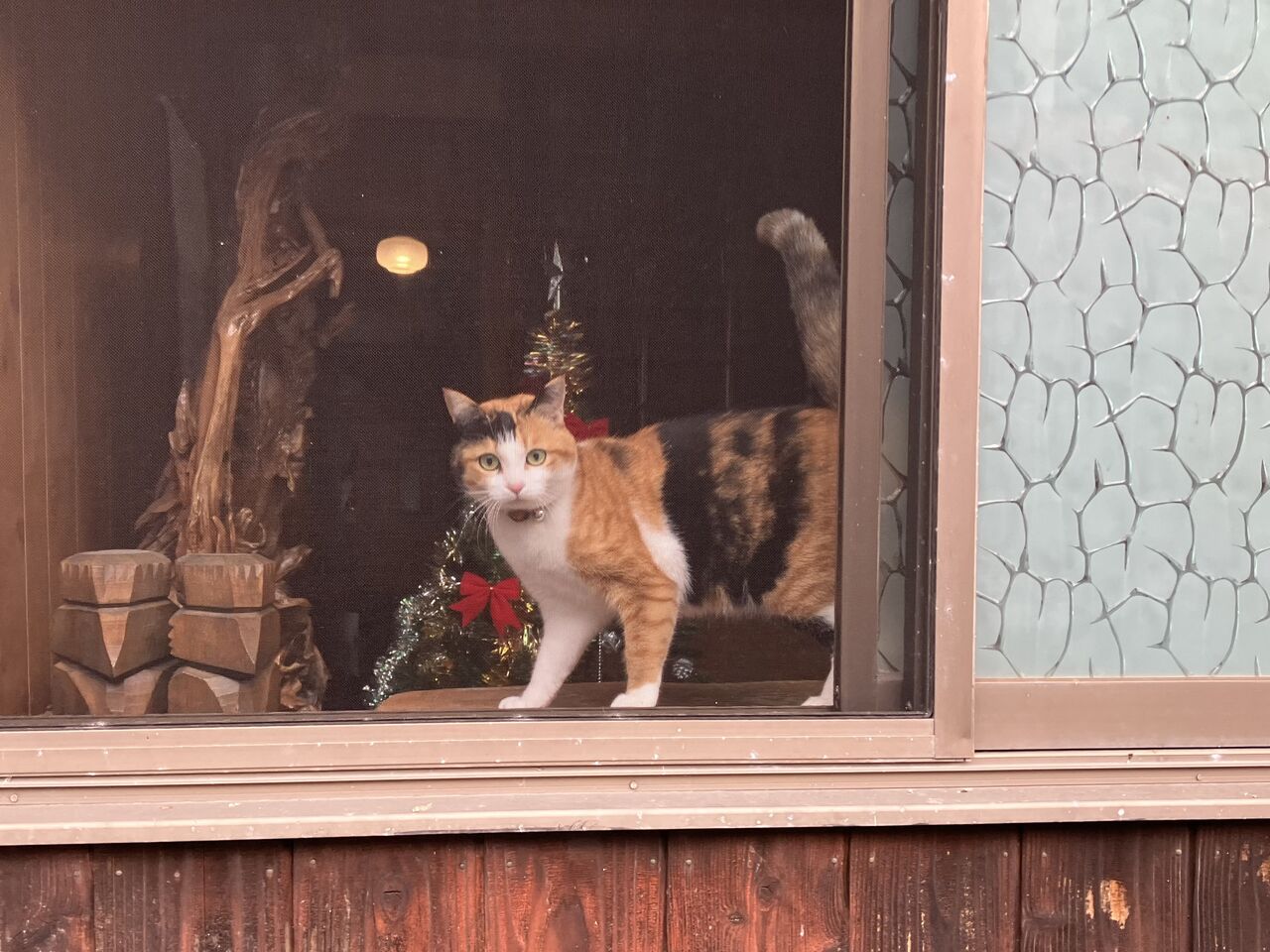 花ちゃんが窓を開けてもらってモミジを眺めていました。(網戸越しです)