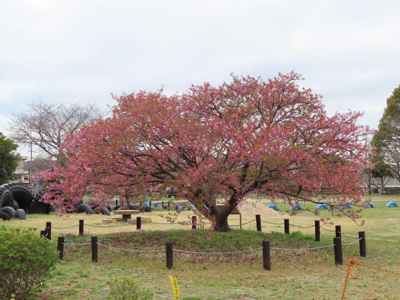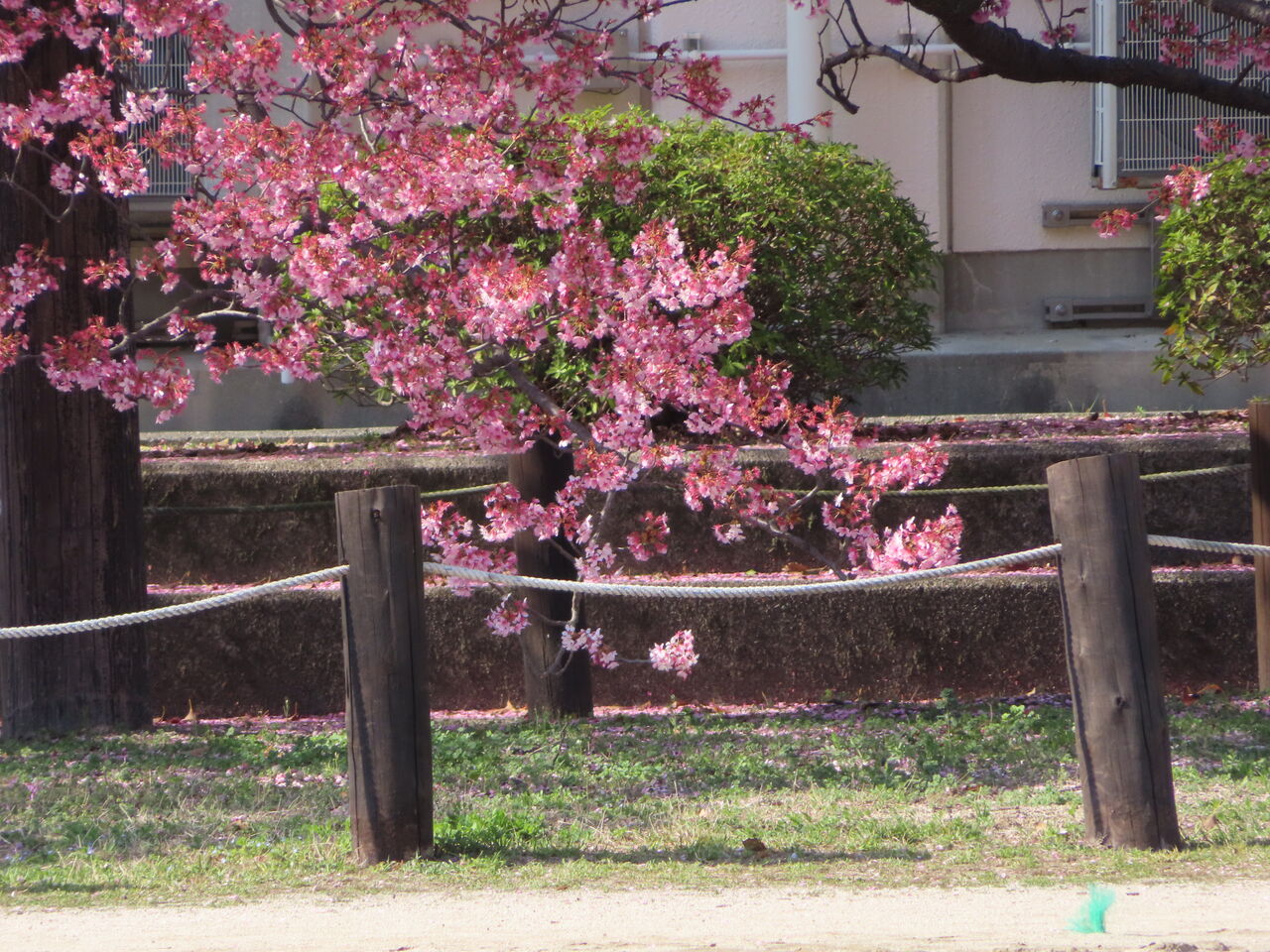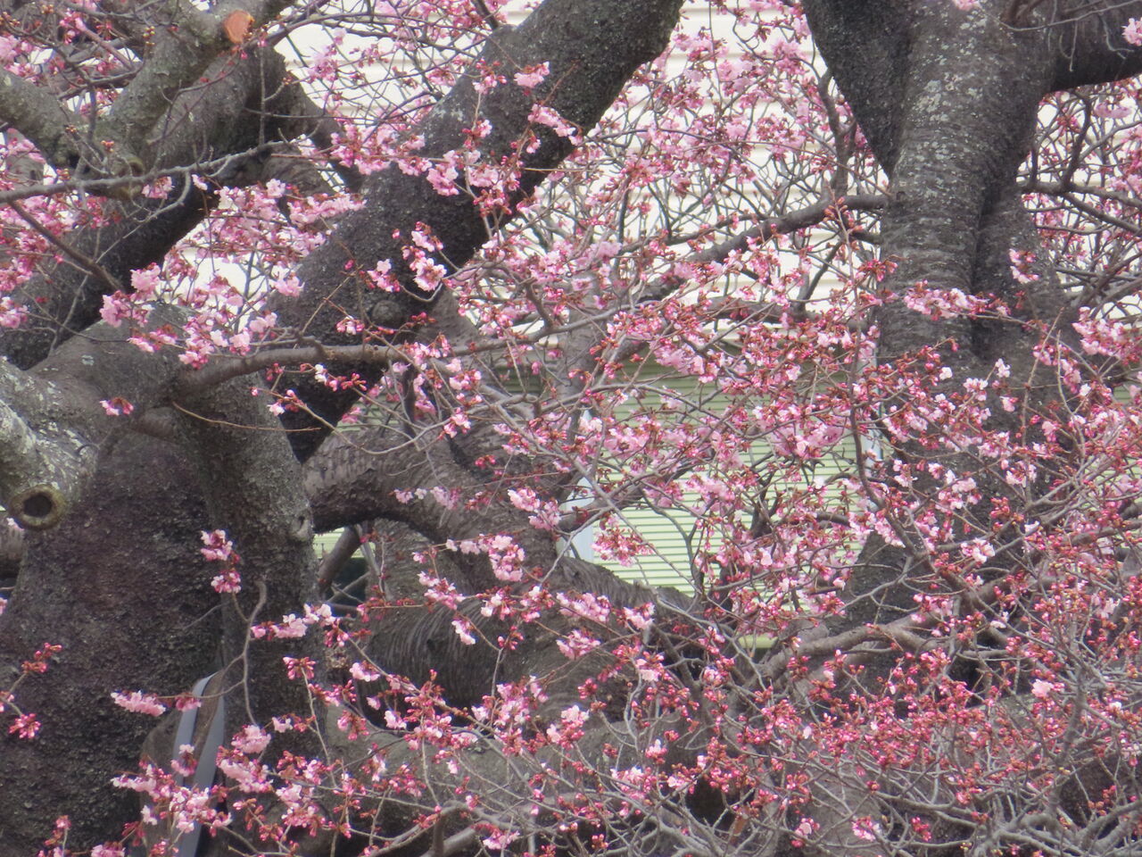 昨日、新築地公園の河津桜を見てきましたが、一部の木は数輪の花をつけていました。