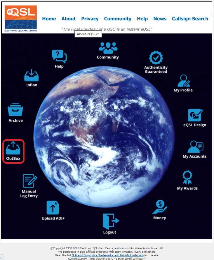 eQSL.ccのホーム画面の「OutBox」から発行済みeQSLカードを確認できます。