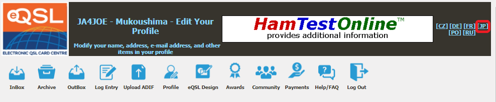 なお、eQSL.ccのホームページは自動翻訳の日本語表示にする事もできます。各画面の右上にある言語選択から [JP] を選ぶと日本語表示になります。(自動翻訳で分かりにくい日本語になる事があるので、私は英語で使っています。)