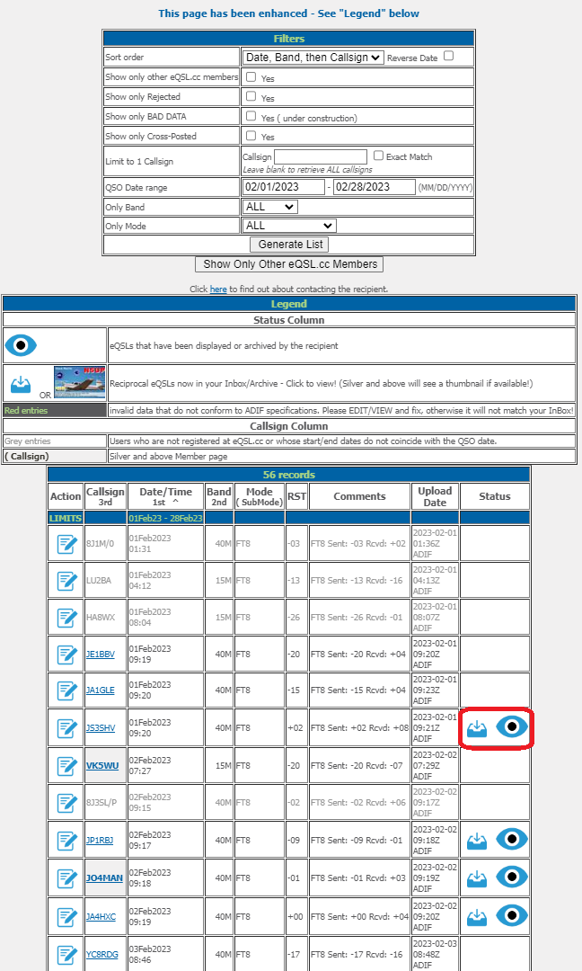 なお、eQSLを発行していない相手からeQSLを送ってきた場合は右端の列に