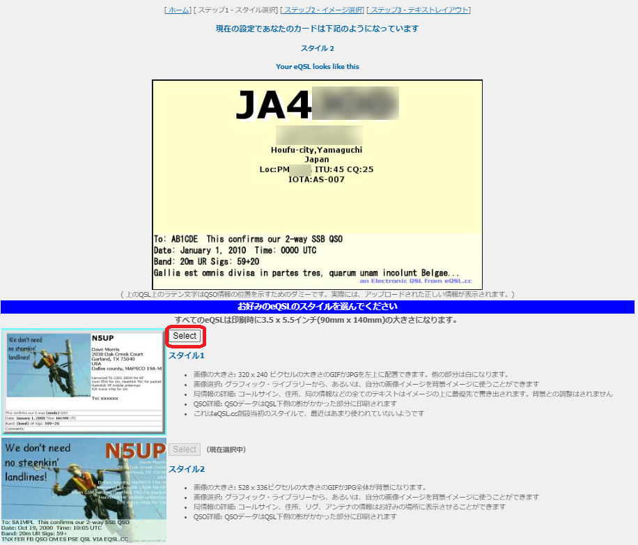 Step1で画像を左上に表示する「スタイル1」を選びました。右側を余白にした方がQTHなどの情報が見やすいと思います。たまに「スタイル2」のような全面画像でNameやQTH、JCCなどが読めないeQSLカードを受取る事があります。
