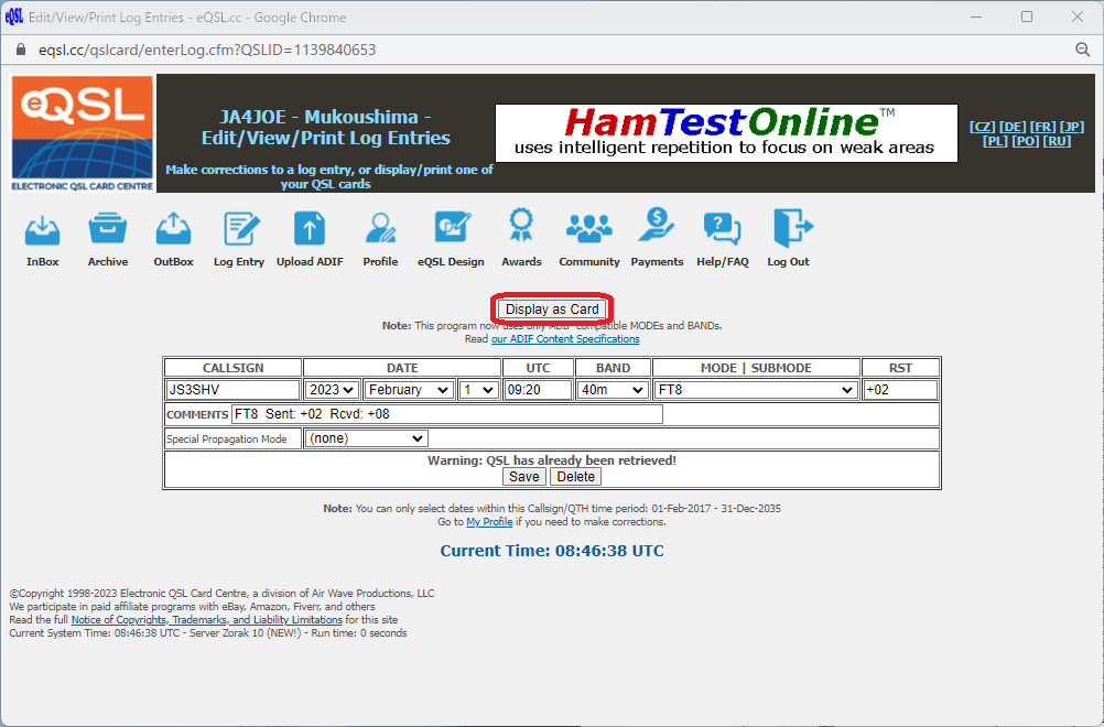 編集画面で[Display as Card] をクリックすると送信したQSLカードの画像を確認できます。
