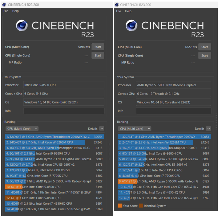 メインで使っているデスクトップのドスパラ Magnate IM Core i5 8400と、今回購入した HP 255 G8 NotePC と のCPUベンチマーク結果です。CINEBENCHを使いました。