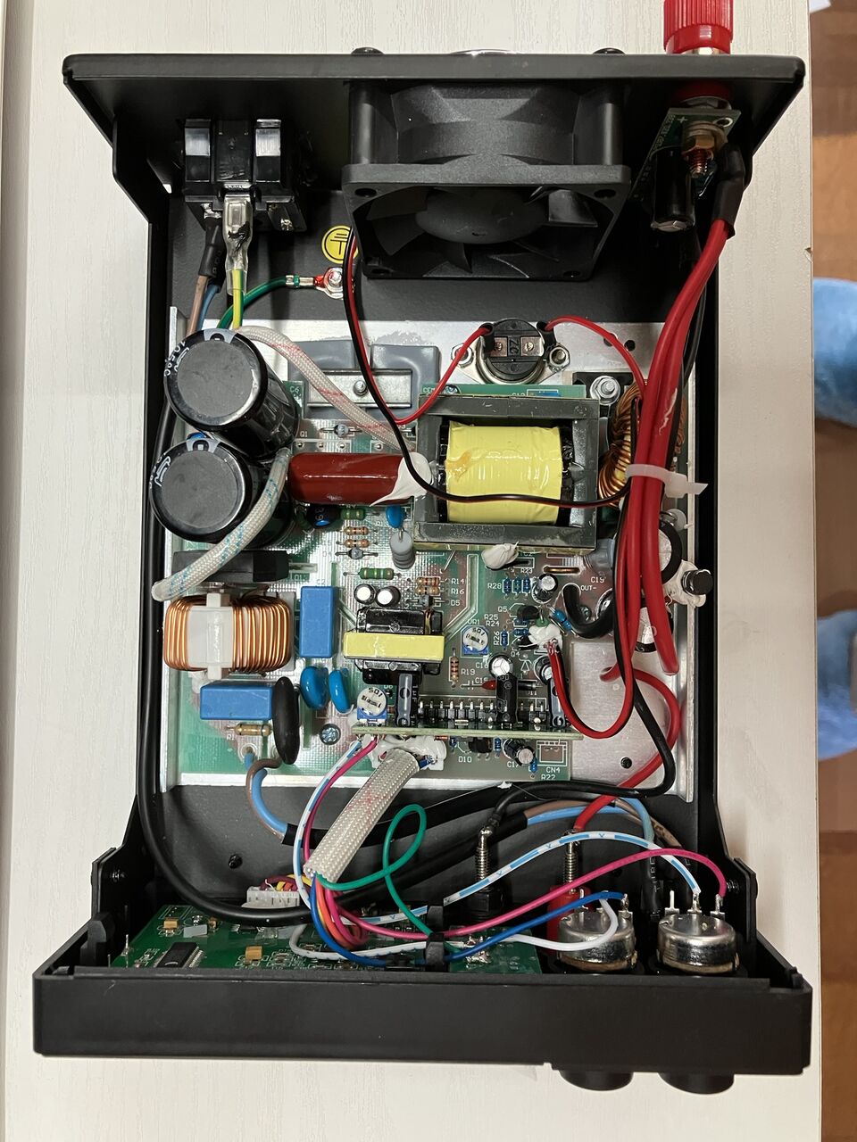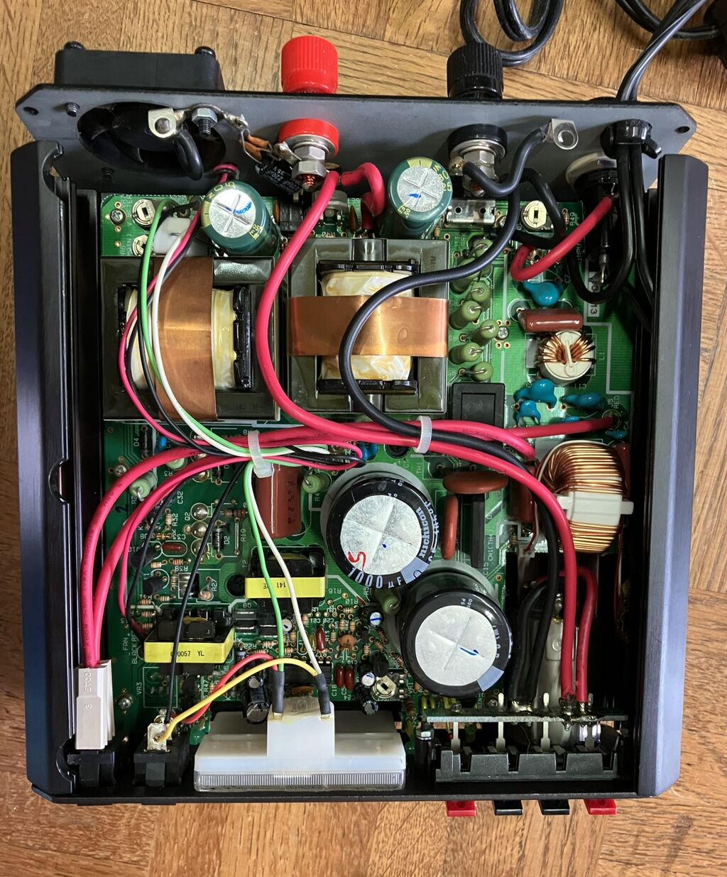 こちらの方がトランスや出力側コンデンサーが大きいですね。スイッチングトランジスターの熱を筐体に逃がす方式は同じですが、こちらは筐体がアルミダイキャストの放熱器構造になっています。ファンの制御はサーミスタ+トランジスターです。