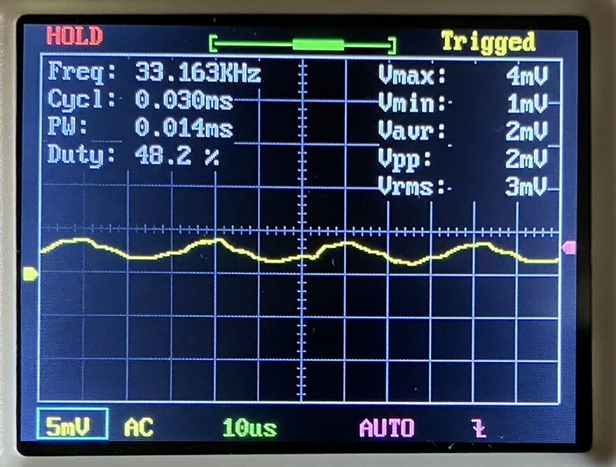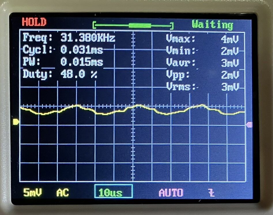 NOISE OFFSETを左に回した状態です。スイッチング周波数31kHZくらいで、リップルは2mVP-Pくらいで小さいです。(5mVが最低測定レンジなので周波数、電圧は不正確です。)