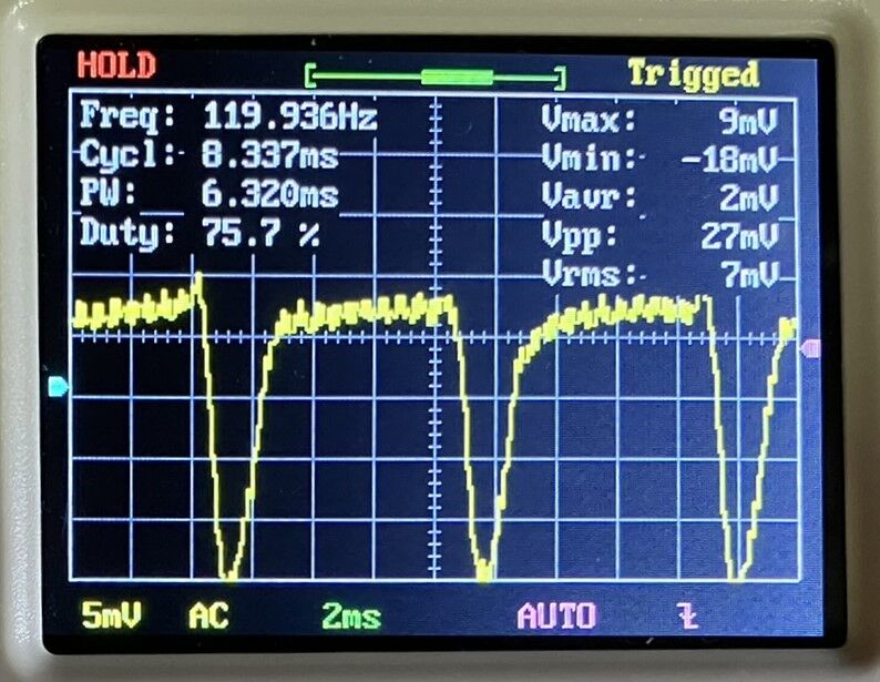続いて出力のリップルを見てみました。格安オシロスコープなので、あまりあてになりませんが、参考にしてください。負荷としてIC-7300Mをつないで受信状態で1.5Aくらいの電流が流れた状態で測定しました。