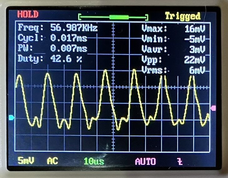 NOISE OFFSETを右に回した状態です。スイッチング周波数33kHZくらいです。NOISE OFFSETで2kHzくらい変化します。