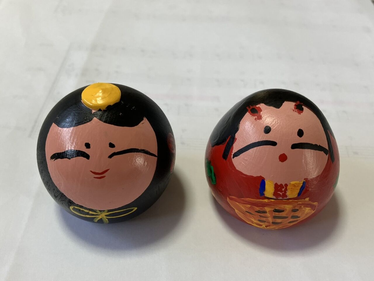 顔の輪郭だけがある丸い木地にアクリル絵の具で顔を書きます。木地は本物の大内人形と同じだそうですが、本物は漆塗りです。同じくらいの大きさのものが2万円とかの値段で売られていました。(^^;