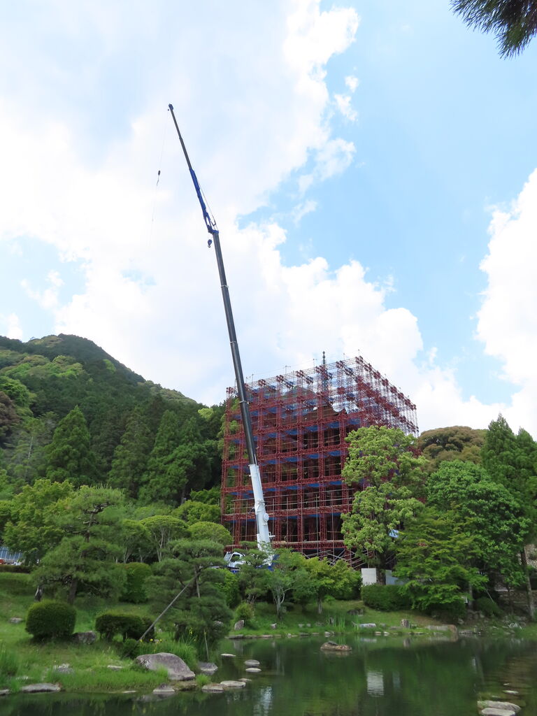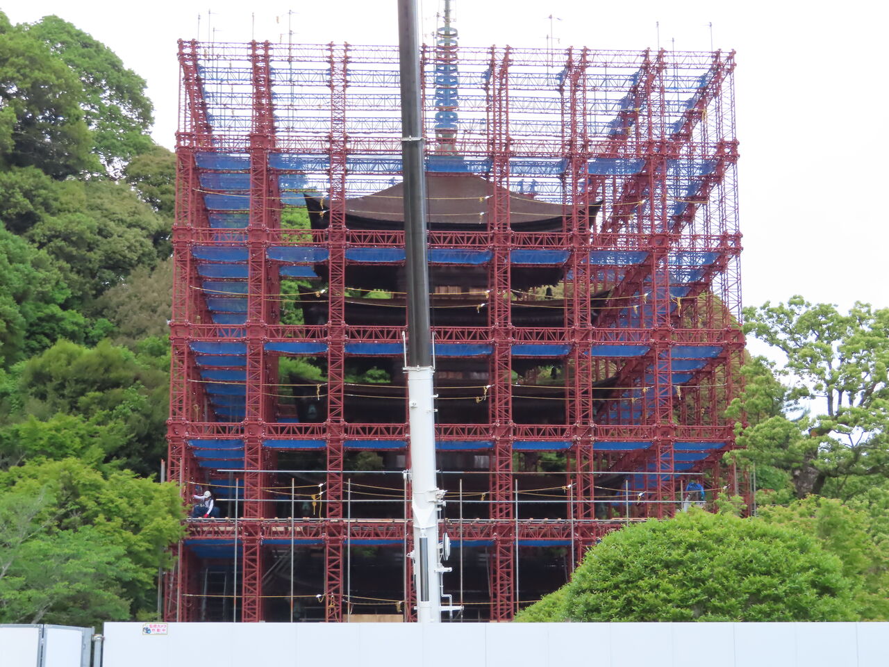 五重塔は屋根の葺き替え中でした。檜皮葺き屋根の檜の皮を交換する工事で、全面葺き替えは1952年度以来との事だそうです。現在は周辺に基礎を作って鉄パイプの足場を立てる作業中のようです。