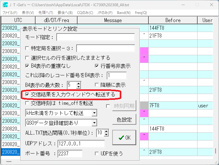 これで、JT-Get's画面に JTDX(WSJT-X)の受信メッセージがリアルタイムに表示されるようになります。